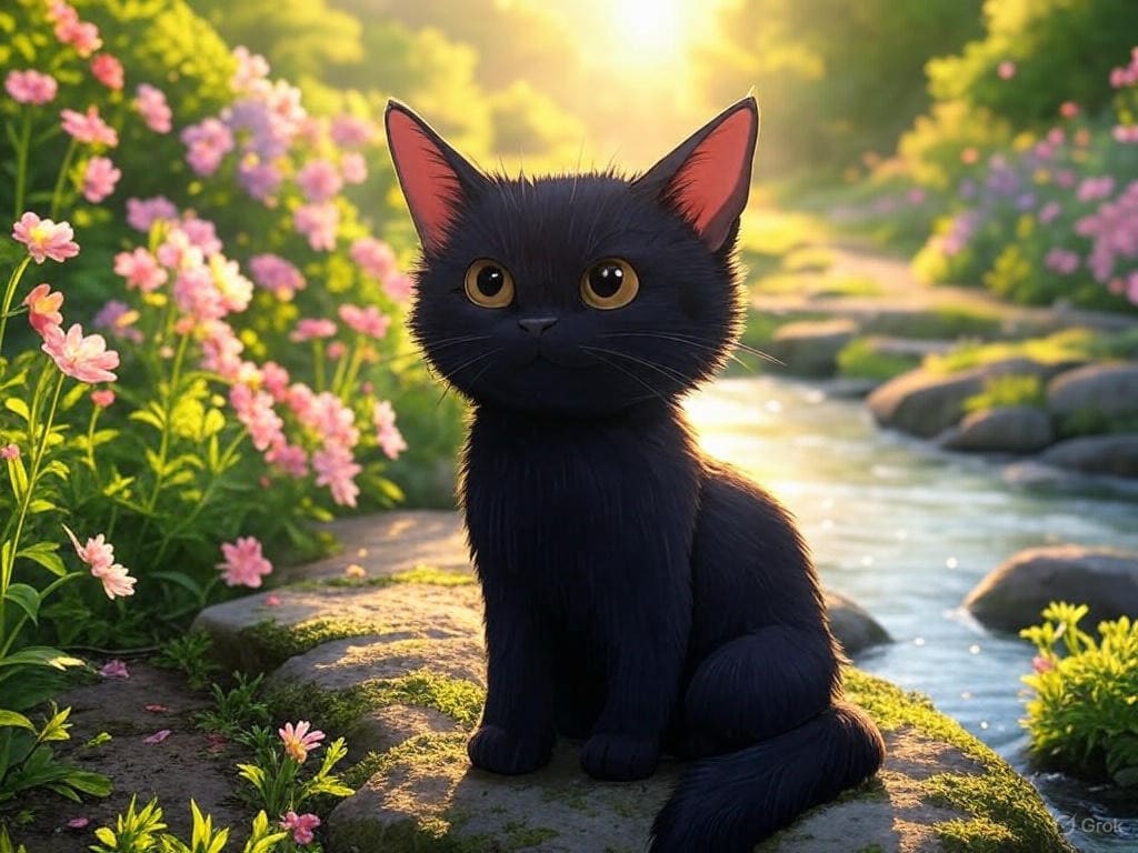 활용 예시: "검은 고양이를 지브리 애니메이션 스타일로 그려주세요. '귀를 기울이면'이나 '마녀 배달부 키키'에 등장하는 동물 캐릭터처럼 표현하되, 원래 고양이의 특징과 개성을 유지해주세요. 배경은 꽃이 만발한 정원으로 하고, 따뜻하고 포근한 분위기를 담아주세요."
